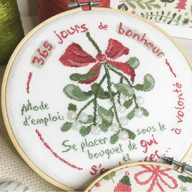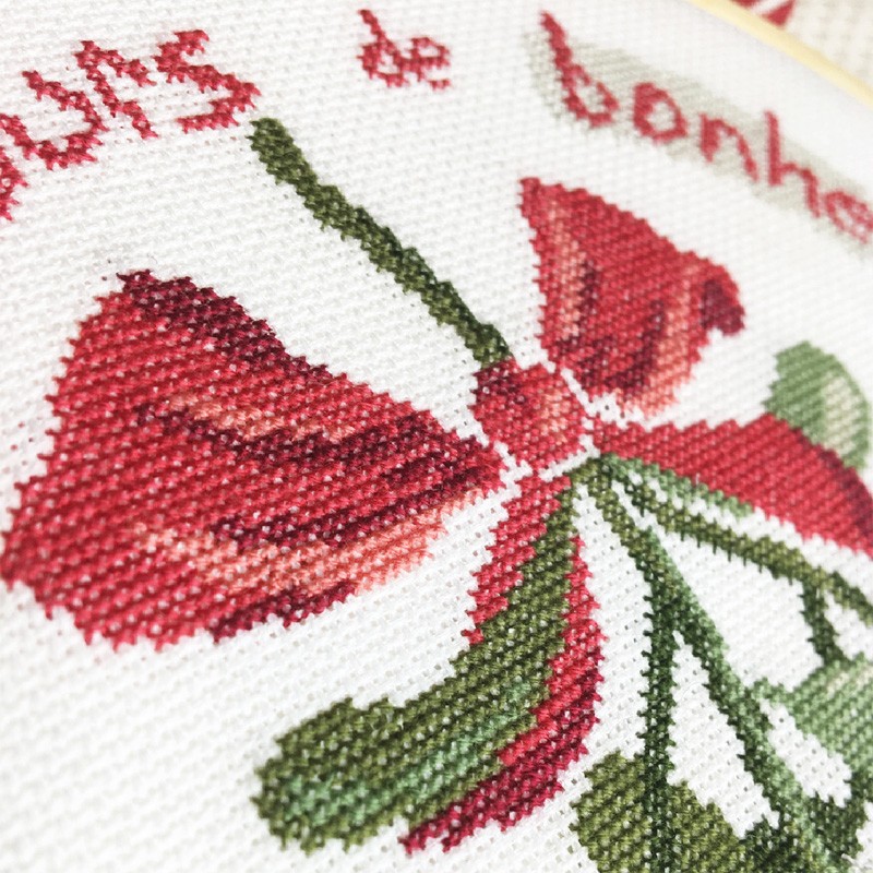 Use an off-white fabric with DMC flosses 33712, 3831, 815, 3072, 524, 3363, 3051, 3051, 934 (not supplied).